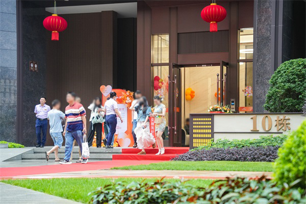 进入小区,园林小径洁净如洗,红毯铺陈、鲜花引路,红灯笼高悬于绿意之间,入户大堂点缀着雅致陈设,处处洋溢着归家的喜悦。这是一场精心筹备的交付仪式,只为以最从容的节奏,迎接新邻居的到来。
