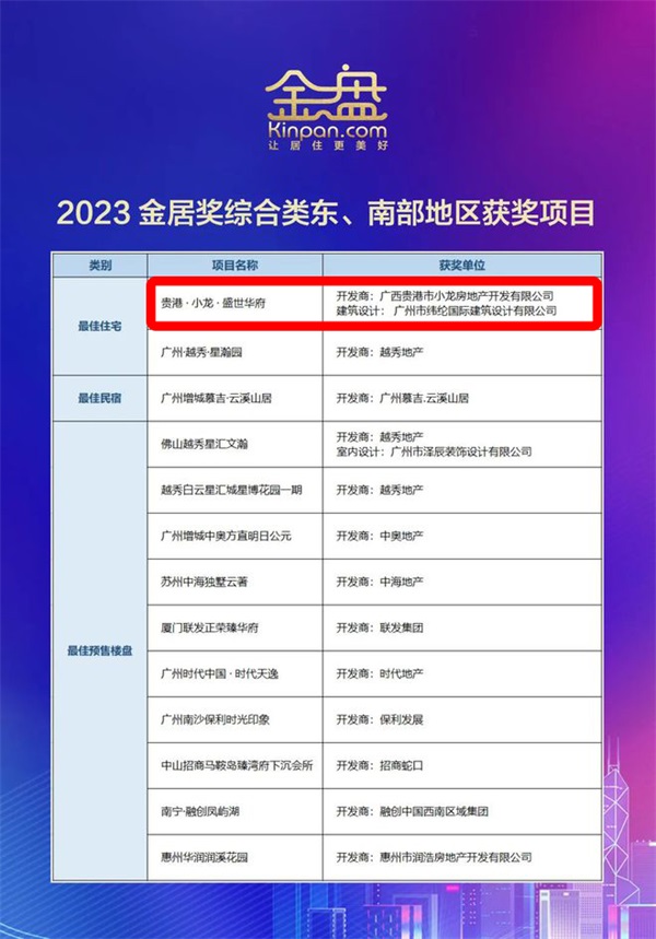 在颁奖典礼上,获奖名单正式揭晓,小龙集团旗下住宅项目——盛世华府,在2023金盘金居奖综合类东、南部地区评选中,凭借卓越的实力、创新的设计、优秀的品质,被金盘奖组委会、《时代楼盘》杂志社、广州金盘网络科技有限公司评为“年度最佳住宅”奖。
