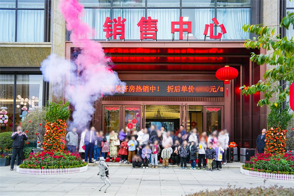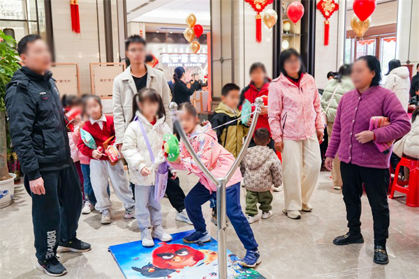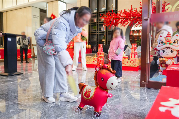 在销售中心,一场“集福之旅”也同步展开。现场科技感十足的机器狗表演吸引了众多目光,灵活的机器人随着音乐节奏舞动、互动,引得孩子们欢呼追逐,成为一道现代与传统交融的趣味风景。活动还设有“欢趣投福气”“马到成功”等互动游戏,业主与客户可领取集福卡参与挑战,每完成一项即加盖福章,集章后可兑换相应礼品。许多家庭组团参与,在游戏中感受新春乐趣与社区活力。