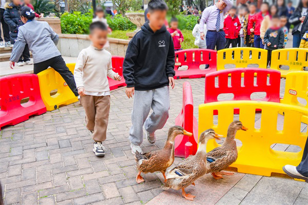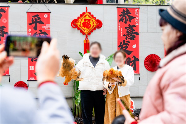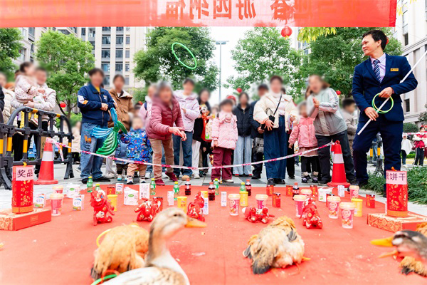 “快乐套圈”区域始终人声鼎沸,将游园会的热闹氛围推向高潮。除饼干、饮料等常见奖品外,活鸡活鸭作为“压轴大奖”吸引众人跃跃欲试。不少眼力准、手感稳的业主凝神屏息,瞄准目标后立马抛出——套中了!霎时间,喝彩声、鼓掌声响成一片。获奖者兴奋地高举战利品,邻里们纷纷道贺,浓浓的年味与邻里温情在此刻满溢。